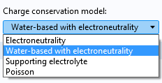 The Tertiary Current Distribution, Nernst-Planck interface now supports four different charge conservation models: electroneutrality, water-based with electroneutrality, supporting electrolyte, and Poisson.