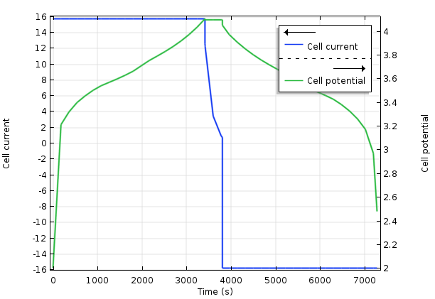 Current and potential during a charge-discharge (constant current-constant voltage) cycle of a lithium-ion battery. From the Batteries & Fuel Cells Module Application Library.