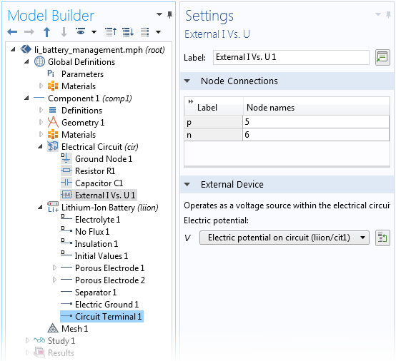 You can use the Circuit Terminal feature on a boundary to specify a coupling to the External I Vs. U node in the Electrical Circuit interface from the AC/DC Module. The Circuit Terminal condition is now also available as a boundary condition in the Electrode Surface node and as an operation mode in the Single Particle Battery interface. This allows you to include high-fidelity battery models in circuit simulations.