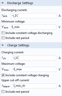 You may use the Charge Discharge Cycling boundary condition to specify load cycling in time-dependent simulations, where the switch between charge and discharge depends on the resulting cell voltage (or current). This feature may, for instance, be used for constant-current/constant-voltage (CCCV) cycling in battery simulations. Charge-discharge cycling is now also available as a boundary condition in the Electrode Surface node and as an operation mode in the Single Particle Battery interface.