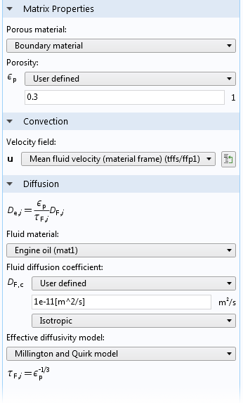 In cases where transport occurs in a fractured, porous 3D structure, the new Fracture boundary condition lets you model transport in the thin fractures without having to mesh them as 3D entities. The Fracture boundary condition is included in the Transport of Diluted Species in Porous Media interface (see image) and has the same settings as in the Transport of Diluted Species in Fractures interface (described above). Fluid flow and chemical species transport are seamlessly coupled between a 3D porous media structure and fluid flow and chemical species transport in a fracture.