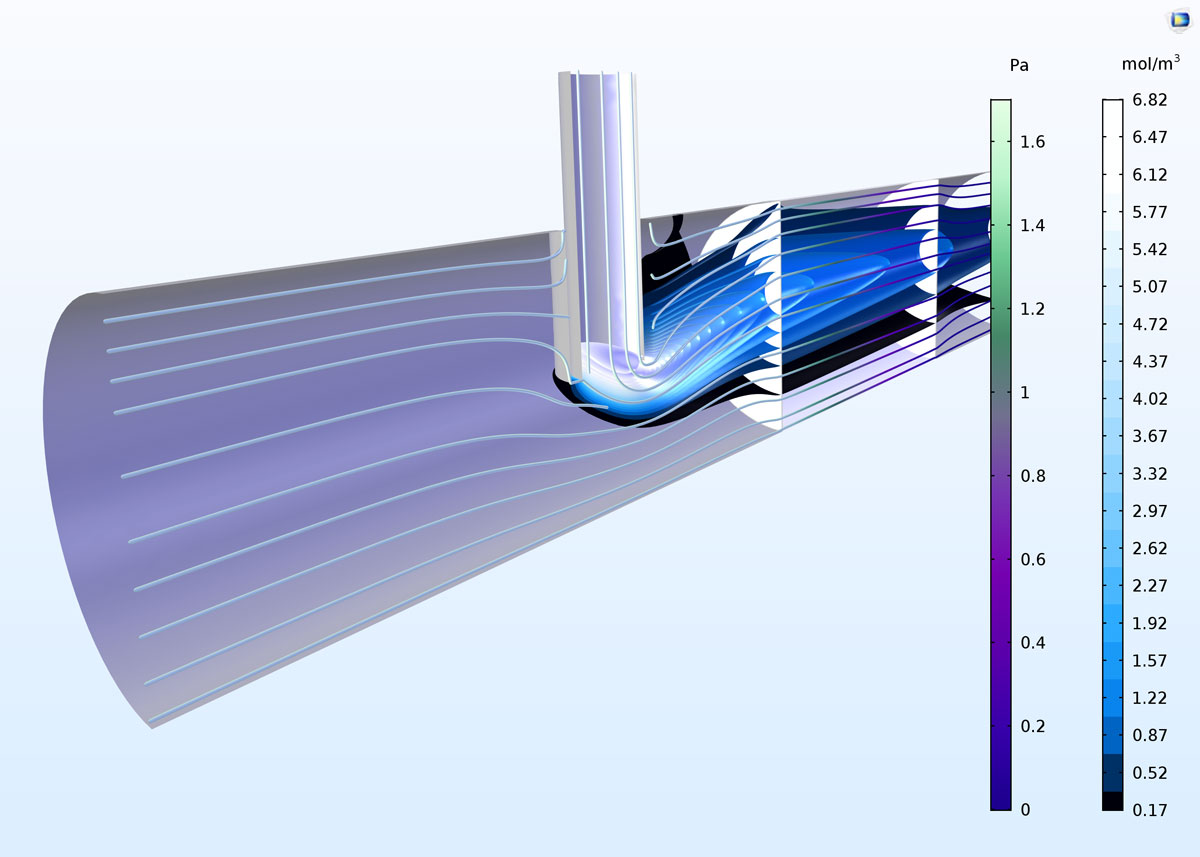 Model of a porous microreactor showing the concentration isosurfaces of a reactant injected through a vertical needle into a free flow containing a second reactant that is then forced through a monolithic catalytic porous media section of the reactor. The model can now be fully defined with the new Reacting Flow in Porous Media multiphysics interface.Application Library path for an example using the new Reacting Flow in Porous Media interface: