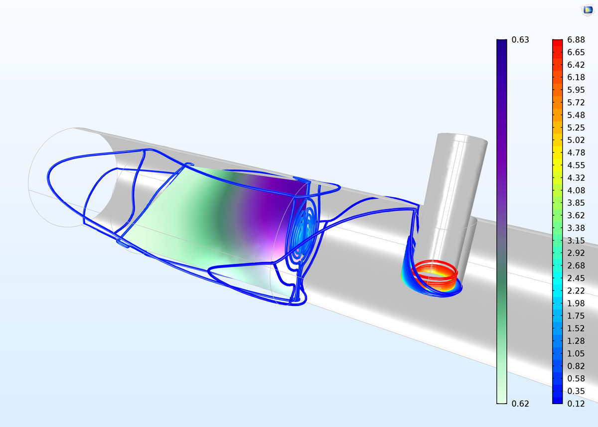 Model of a porous microreactor showing the concentration isosurfaces of a reactant injected through a vertical needle into a free flow containing a second reactant that is then forced through a monolithic catalytic porous media section of the reactor. The model can now be fully defined with the new Reacting Flow in Porous Media multiphysics interface.Application Library path for an example using the new Reacting Flow in Porous Media interface: