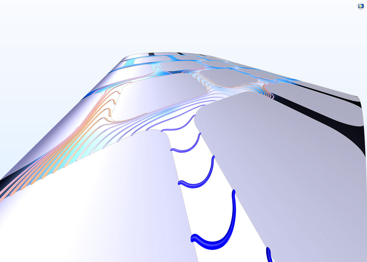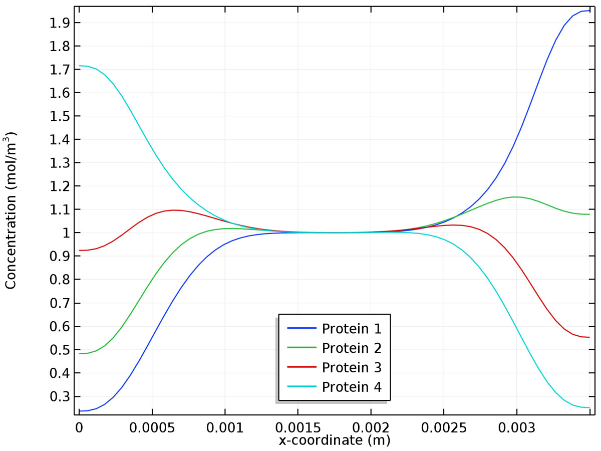 This example applies the Electrophoretic Transport and Laminar Flow interfaces to model isoelectric separation in a free-flow electrophoresis device. A stream containing four different proteins separates into concentrated streams by means of migrative transport in an electric field.