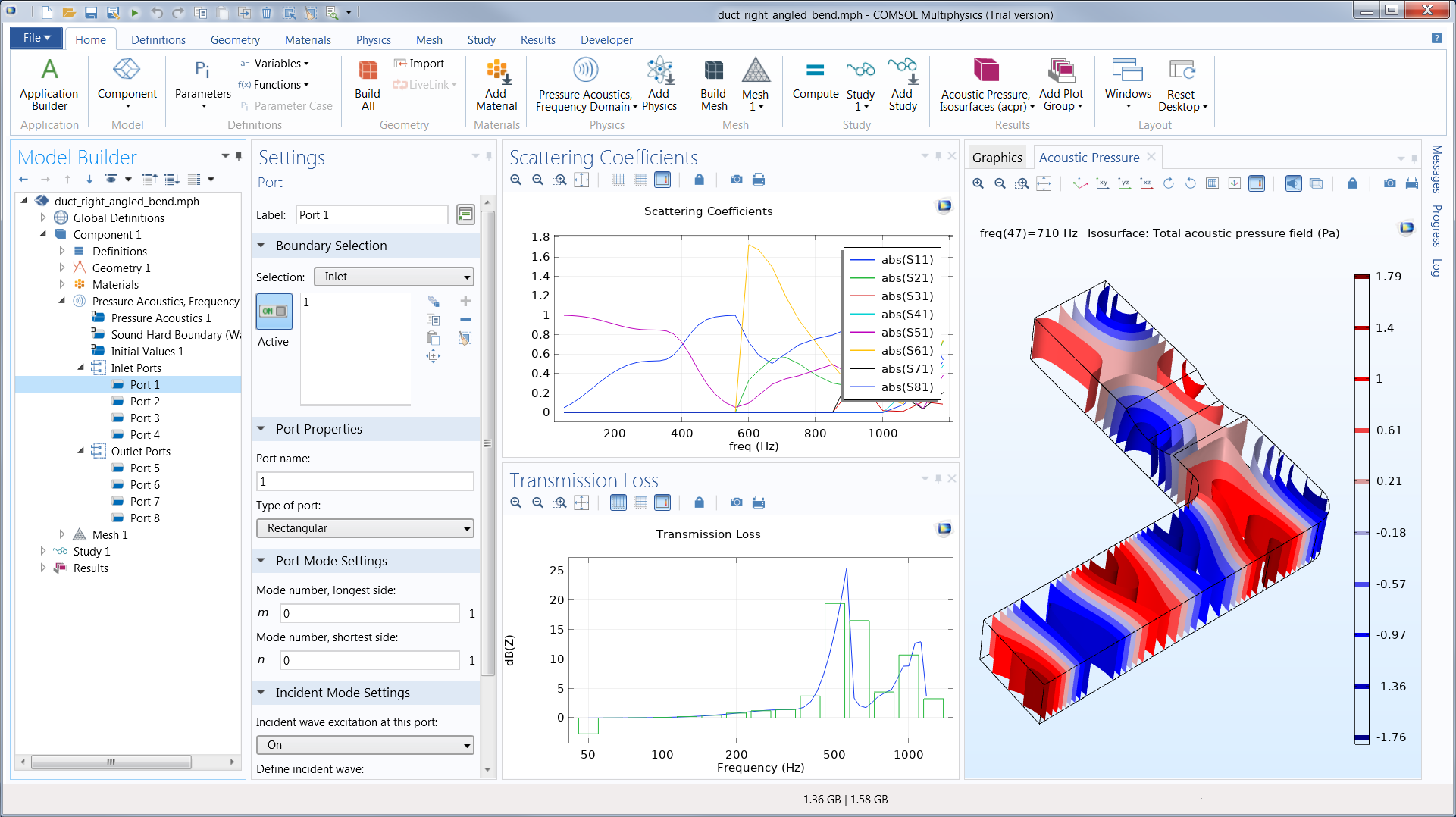 Port feature Settings window with the rectangular port type selected and wave excitation enabled for the plane wave mode (0,0). The results show the computed scattering coefficients and transmission loss of the duct system, as well as an isosurface plot of the pressure at 710 Hz.